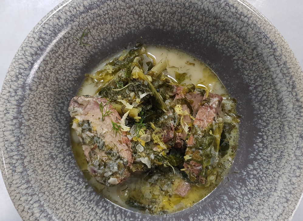 Μόλις το αυγολέμονο πάρει τη θερμοκρασία του φαγητού τότε το ρίχνουμε στην κατσαρόλα. Ξαναβάζουμε την κατσαρόλα σε σιγανή φωτιά, ανακινώντας την συνεχώς για να απλωθεί το αυγολέμονο ομοιόμορφα με τον υπόλοιπο ζωμό της κατσαρόλας. Σερβίρουμε αμέσως.
